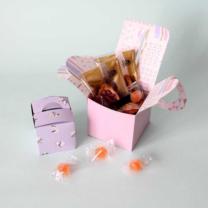 ワンタッチで組み立て簡単な手提げ付きボックス。 お菓子や小物など入れたりちょっとしたプレゼントに最適です。